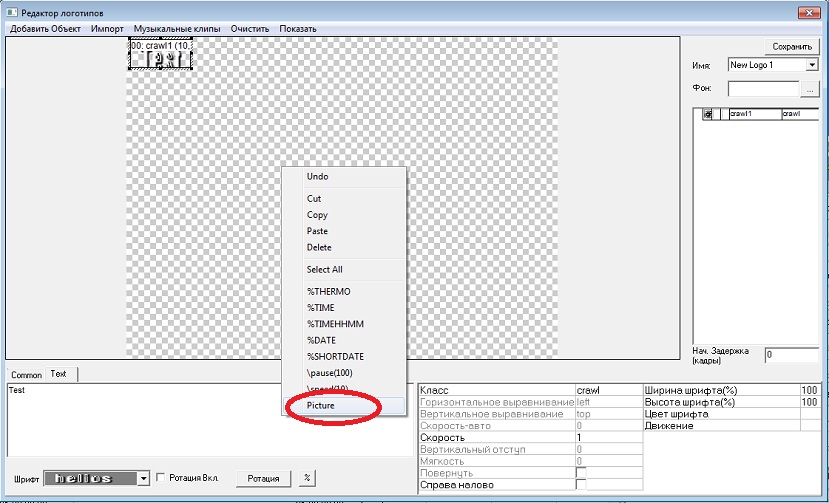 Другой вариант заключается в том, чтобы использовать анимационный логотип, как объект (элемент) композиции переднего плана (логотипа). В таком варианте нужно конвертировать последовательность TGA файлов с альфа-каналом в специальный формат LOGO. Размерность файла может быть меньше 720x576, например 100х100 пикселей. В редакторе логотипов нужно будет добавить объект типа Logo и указать в качестве картинки LOGO-файл, созданный конвертером. Можно было указать путь и к первому файлу TGA-последовательности, но использование LOGO формата экономит память и дает преимущество в производительности.